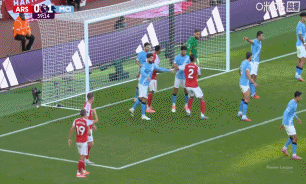 第9分钟,曼城后场得球快速策动进攻,哈兰德分球,赖因德斯持球一路推进,随后又斜传给快速前插的哈兰德,后者禁区内几乎单刀球机会,一脚低射洞穿拉亚十指关,曼城1-0阿森纳。↓